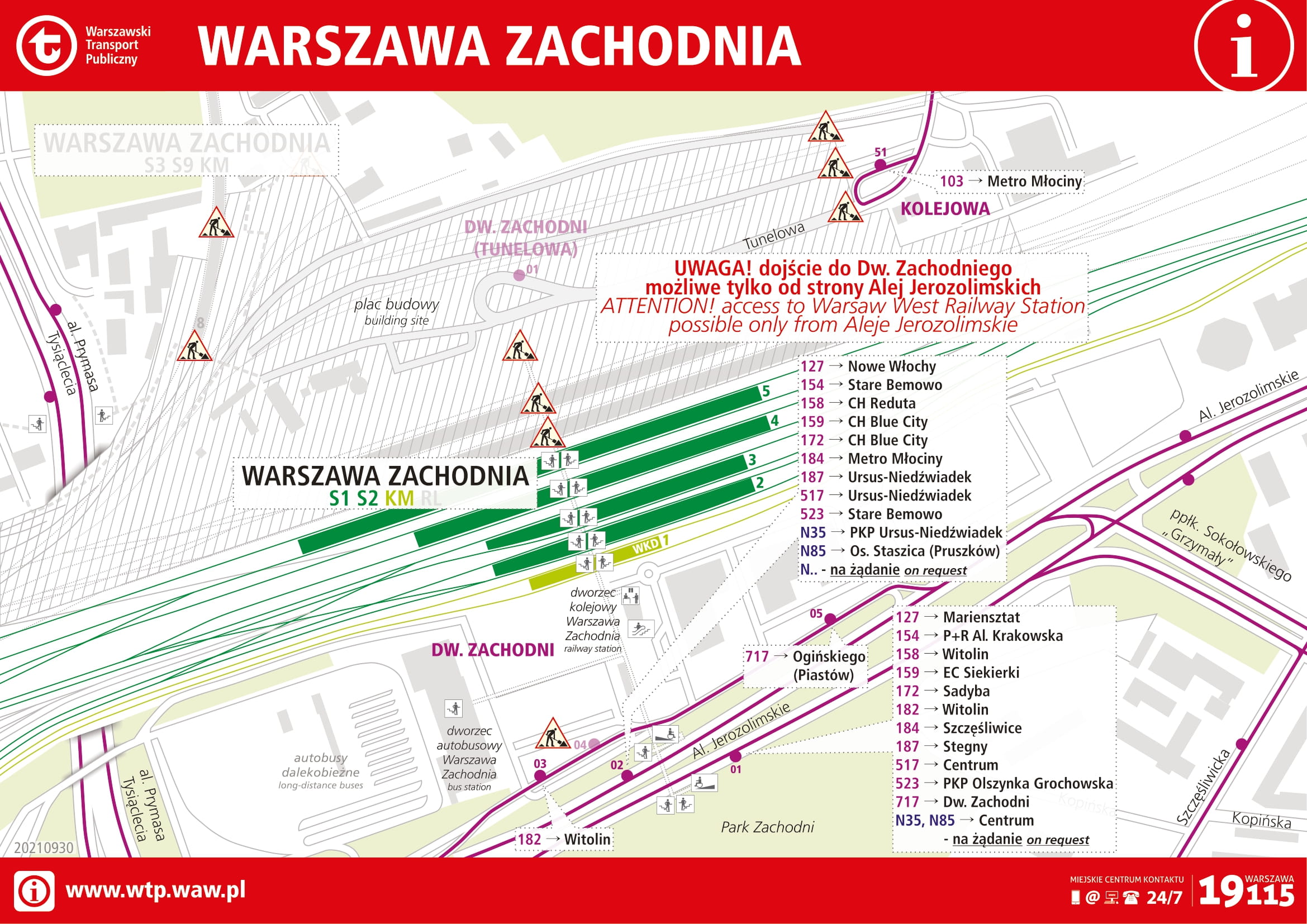 Західний залізничний вокзал (Двожец Заходні) - це залізничний і автобусний вокзали. З вокзалу відправляються потяги далекого прямування та приміські поїзди, а також автобуси далекого прямування. Зупинки міських автобусів розташовані в безпосередній близькості від автовокзалу і з'єднані з залізничними платформами підземним переходом.